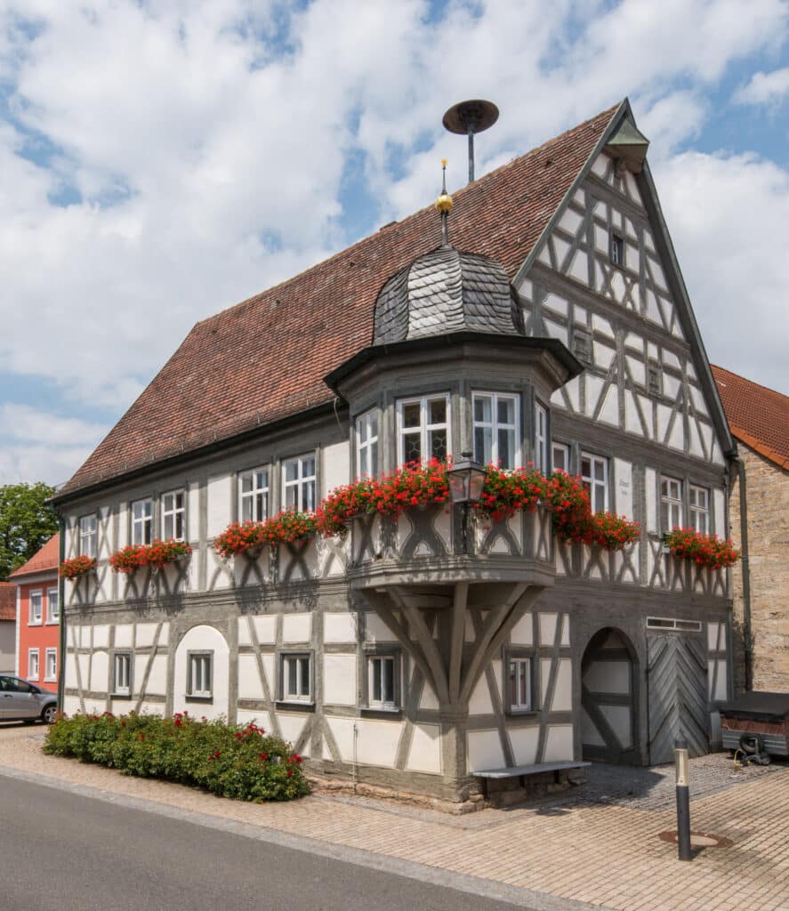 Das Rathaus, erbaut im Jahre 1666 ist ein hübscher zweigeschossiger Renaissance-Fachwerkbau mit Achteckserker im Obergeschoss und einem hohen Satteldach. Das Erdgeschoss durchschneidet in der Längsachse einen öffentlichen Durchgang. Zur Straßenseite hin befand sich früher die öffentliche Bücherei, auf der anderen Seite ist das Gemeindearchiv und ein Lagerraum. In der nordwestlichen Ecke führt eine Treppe zum Obergeschoss, das neben dem Geschäftszimmer, Registratur und sanitären Anlagen als Prunkstück das Sitzungszimmer enthält.